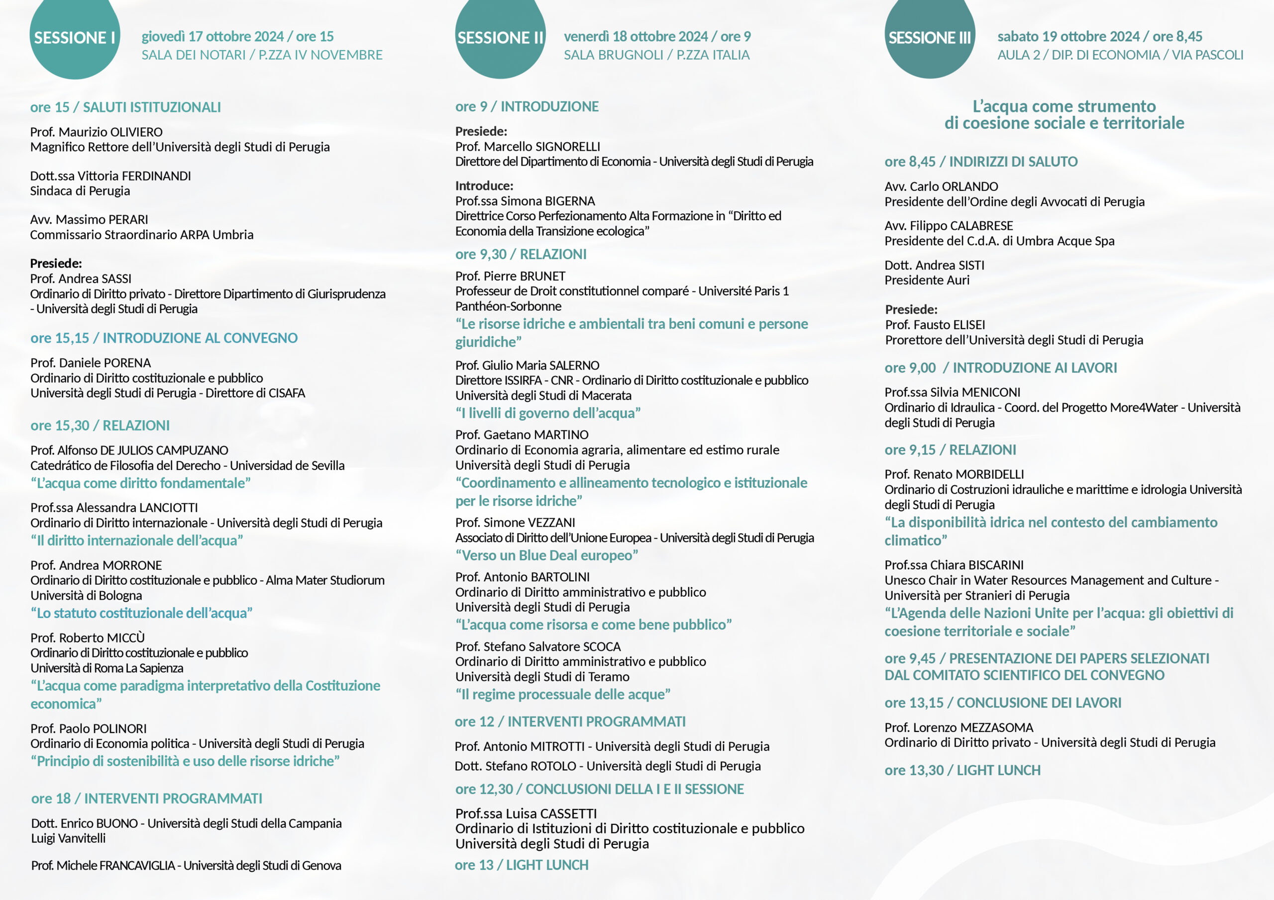 La prima sessione si svolgerà presso la Sala dei Notari a partire dalle ore 15 del 17 ottobre. Nella mattina del giorno seguente, a partire dalle 9, i lavori proseguiranno presso la Sala Brugnoli della Regione dell’Umbria. Infine, nella mattina di sabato 19, a partire dalle ore 8.45, il Convegno sarà ospitato presso l’Aula II del Dipartimento di Economia dove avrà luogo la sessione su “L’acqua come strumento di coesione sociale e territoriale”. In chiusura, ci sarà la presentazione dei papers selezionati dal Comitato scientifico del convegno a conclusione della call for abstract aperta nelle scorse settimane.