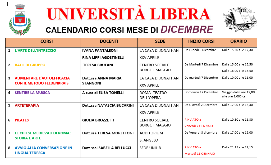 L’Università Libera di Bastia Umbra ricorda i corsi in partenza a Dicembre: