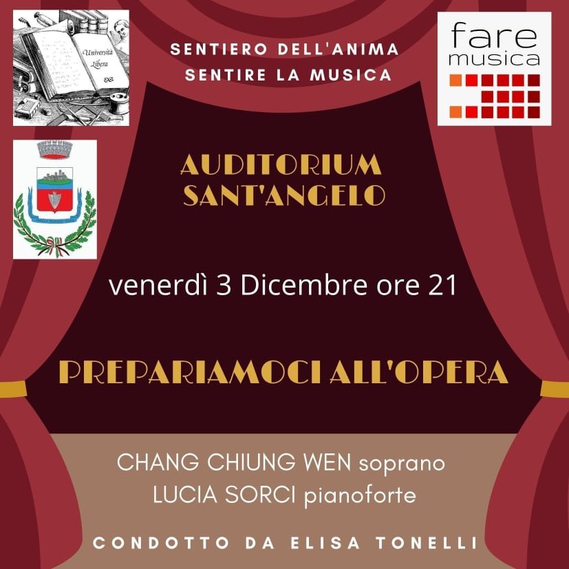 Una conferenza/concerto che aiuterà ad approfondire le Opere in programma per questo anno accademico nel “Sentiero dell’Anima”, per il Corso “Sentire la Musica”. Un incontro dedicato all’Opera, condotto da Elisa Tonelli, con Chang Chiung Wen soprano e Lucia Sorci al pianoforte.