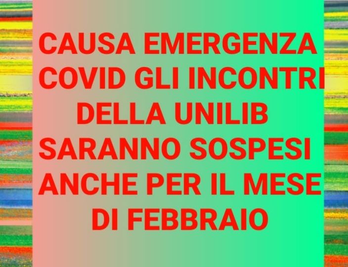 Il Sindaco Paola Lungarotti e il Direttivo della Unilib, insieme alla Presidente Rosella Aristei, comunicano che causa emergenza Covid e per la massima tutela della sicurezza di tutti gli incontri, i corsi della Unilib del Comune di Bastia Umbra saranno sospesi anche per il mese di Febbraio 2022 , con l’auspicio di far ripartire tutte le attività nel mese di Marzo.