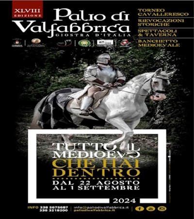 Valfabbrica 7 agosto ‘24 – Arriva alla sua 48 edizione il Palio di Valfabbrica (22 agosto-1settembre), manifestazione con giostra storica che è in grado di mettere da parte campanilismi e differenze. Undici giorni in cui il suggestivo borgo umbro si immergerà nel Medioevo, dove i tre Rioni: Badia (zona dell’abbazia e del monastero benedettino), Osteria (zona rurale per le soste dei viandanti) e Pedicino (zona del castello) si sfideranno tramite bellissime e coinvolgenti rievocazioni. Tuttavia, il momento di maggior suspense si raggiungerà durante la Giostra il 01 settembre, ultimo giorno della manifestazione, dove i cavalieri dei tre Rioni dovranno superare tre prove: la Corsa agli Anelli, la Corsa del Saracino e lo Scontro Diretto. L’evento sarà ufficialmente presentata martedì 20 agosto a Perugia.