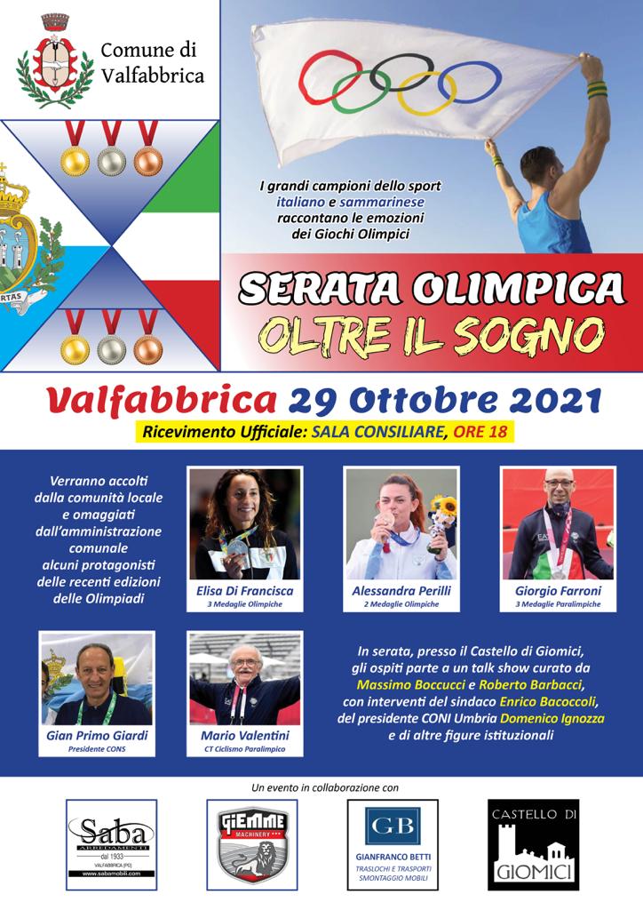 Il Comune di Valfabbrica organizza per venerdì 29 ottobre 2021 l’evento “Serata Olimpica – Oltre il Sogno” dedicato ai Giochi Olimpici e Paralimpici Tokyo2020.