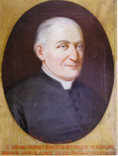 Don Antonio Pennacchi è nato a Bettona il 27 gennaio 1782 ed è morto nel 1848. Visse in Assisi, nella parrocchia di San Pietro. Si sentì chiamato dal Signore alla vocazione sacerdotale e a 18 anni, all’inizio del 1800 si trasferì in Assisi per continuare gli studi filosofici e teologici. Si distinse subito per la sua intelligenza, per il suo impegno e per la pietà. Fu ordinato sacerdote il 22 marzo 1806 dal vescovo Francesco Maria Giampé che, per la sua grande cultura, lo nominò insegnante di grammatica superiore nelle scuole municipali di Assisi e cappellano nella chiesa abbaziale di San Pietro e delle suore clarisse francescane di Sant’Andrea. Il fondamento della sua spiritualità sarà il mistero dell’Annunciazione e dell’Incarnazione del Figlio di Dio e per tutta la sua vita sarà l’apostolo dei nomi di Gesù e Maria. Da qui nascerà il suo amore alla povertà, alla preghiera, all’umiltà e penitenza sull’esempio di San Francesco. La causa di beatificazione, aperta all’inizio del ‘900, per contingenze storiche, non ebbe seguito e solo nel giugno del 2016 è stata riavviata con un decreto del vescovo Sorrentino. Il 14 marzo 2019 si è chiusa la fase diocesana del processo di beatificazione e canonizzazione del Venerabile ed è iniziata così la seconda fase.