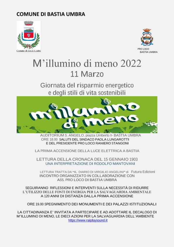 Anche quest’anno l’ Amministrazione comunale di Bastia Umbra aderisce all’iniziativa patrocinata dal Parlamento Europeo, Presidenza della Repubblica, Ministero dell’Ambiente “M’illumino di meno” – la giornata di mobilitazione internazionale in nome del risparmio energetico – incentivando la riflessione sul tema dello spreco energetico e sul consumo intelligente di energia.