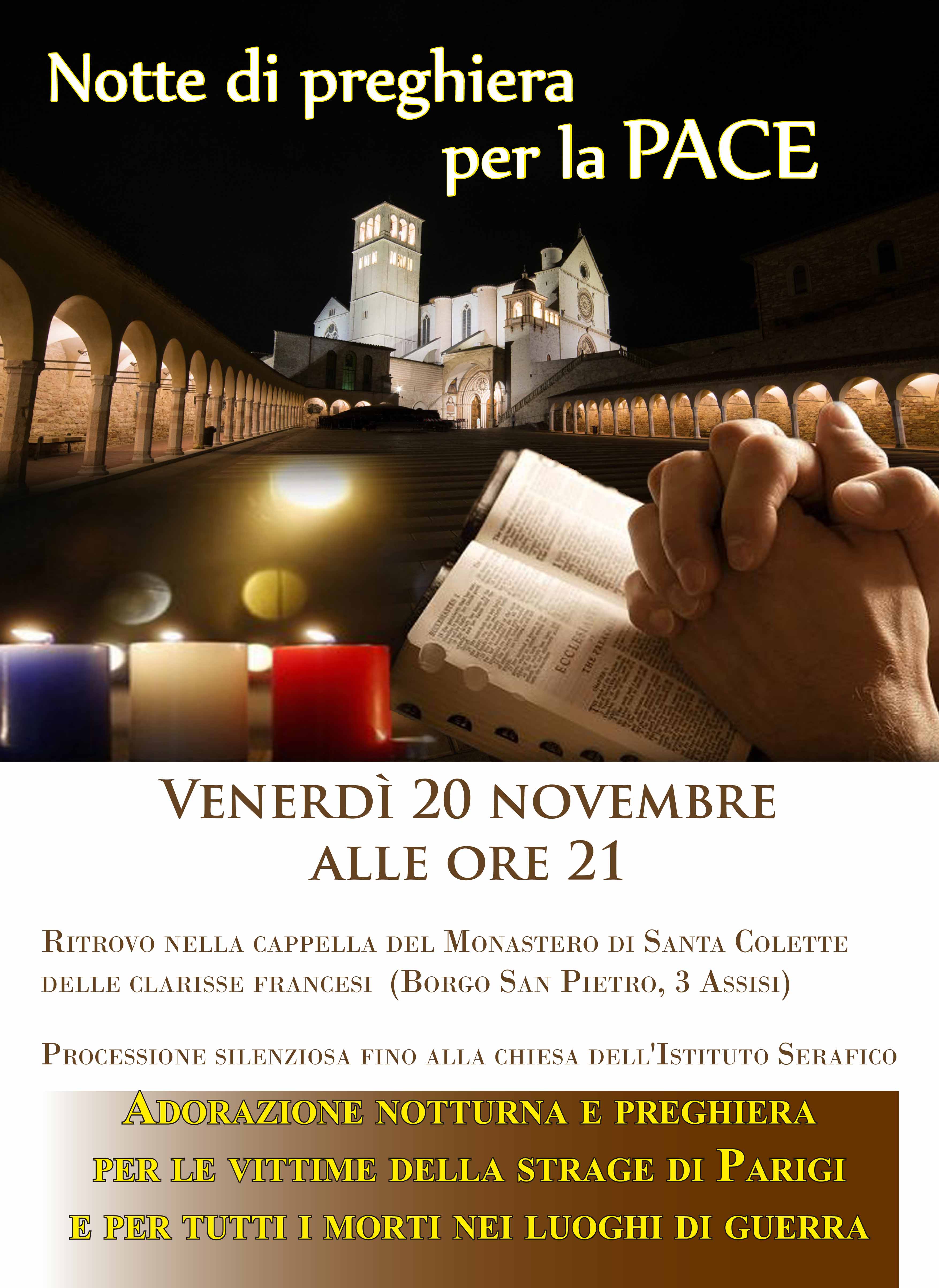 ASSISI – Una veglia di preghiera per le vittime di Parigi e per tutti gli altri morti nei luoghi di guerra. Ad una settimana dalla strage del 13 novembre la diocesi di Assisi – Nocera Umbra – Gualdo Tadino chiama a raccolta tutta la comunità venerdì 20 novembre alle ore 21 per dimostrare la propria vicinanza al popolo francese colpito dai gravi fatti di sangue accaduti nei giorni scorsi. “Il sangue versato dal terrorismo islamico a Parigi – sottolinea il vescovo monsignor Domenico Sorrentino – scuote ancora una volta le nostre coscienze. Assisi, città della pace, fa lutto per le vittime. Diciamo la nostra solidarietà al Paese colpito. Lo vogliamo fare anche in modo più ‘familiare’, esprimendo la nostra vicinanza alle Monache colettine che sono per noi un prezioso frammento della Francia in Assisi. Per questo, a una settimana dai luttuosi eventi parigini, venerdì 20 alle ore 21 ci metteremo in preghiera, con una veglia che si terrà nel loro Monastero, in via Borgo San Pietro. La preghiera si farà poi cammino silenzioso fino all’Istituto Serafico, luogo-simbolo di servizio alla vita, dove ci si potrà fermare per l’adorazione notturna. Pregheremo non solo per le vittime di questi giorni in Francia – aggiunge ancora il vescovo – ma anche per le innumerevoli vittime nelle regioni del Medio oriente funestate dall’Isis e dalle altre situazioni di conflitto. D’altra parte, vogliamo sottolineare con forza che il terrorismo non può gettare ombra sui musulmani che vivono la loro fede con sentimenti e pensieri di pace. E’ quell’Islam che abbiamo conosciuto ad Assisi il 27 ottobre scorso, nell’anniversario della grande preghiera per la pace voluta da san Giovanni Paolo II. Ci siamo allora abbracciati, cristiani, ebrei ed islamici, ricordando la comune origine abramitica delle nostre fedi. Da questo cammino di dialogo e di pace – continua ancora il vescovo – nessun attacco terroristico ci potrà far recedere. La veglia di venerdì vorrà ribadirlo, come un segnale che intendiamo dare come Chiesa a tutta la nostra gente. Per i terroristi – mandanti ed esecutori – chiederemo a Dio, al quale così infelicemente si appellano, di aprire i loro cuori. A nessuno è lecito uccidere, mai, tanto meno in nome di Dio! Pregheremo perché i responsabili della politica mondiale riescano a trovare strade non violente ma efficaci per fermare la furia omicida. Sappiamo che la soluzione non è facile. Sono ormai decenni che invano si tenta di bloccare il terrore e di promuovere processi democratici con la logica delle armi. Occorre forse ripensare totalmente le strategie finora messe in campo. Ma chi sa indicarci la strada, se non lo Spirito di Dio? A lui la nostra invocazione. E’ per questo – conclude monsignor Sorrentino – che invito tutti i fedeli, i rappresentanti delle istituzioni e gli esponenti delle altre religioni ad unirsi a questo momento di testimonianza per la pace”.