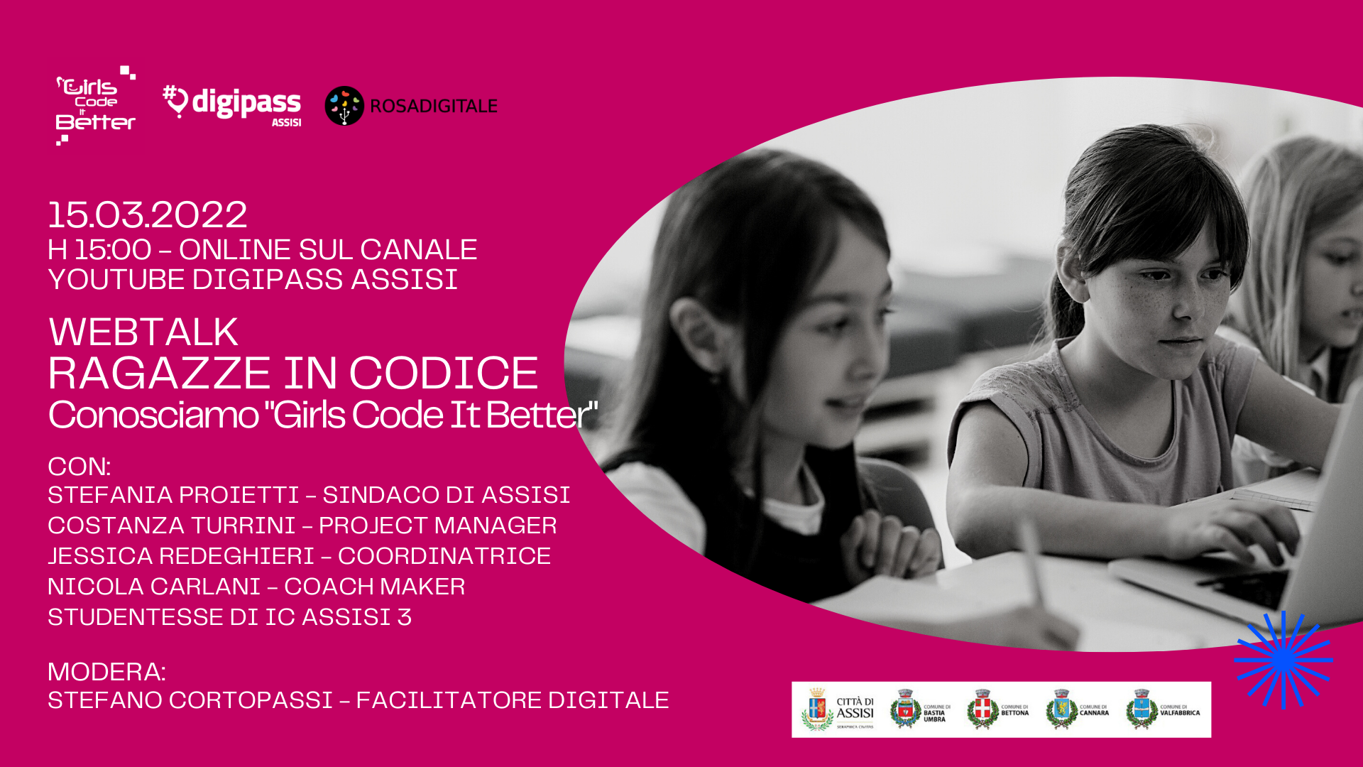 Durante il webtalk del 15 Marzo, visibile in diretta sul canale youtube del Digipass di Assisi, interverrà per un saluto Stefania Proetti (Sindaco di Assisi) e, a seguire, racconteranno il progetto Costanza Turrini (Ideatrice e Project Manager di Girls code it better), Jessica Redeghieri (Girls code it better, Coordinatrice dei club) e Nicola Carlani (Coach Maker). Saranno infine le studentesse che frequentano il laboratorio a raccontare quello che è stato il percorso finora e cosa stanno creando.